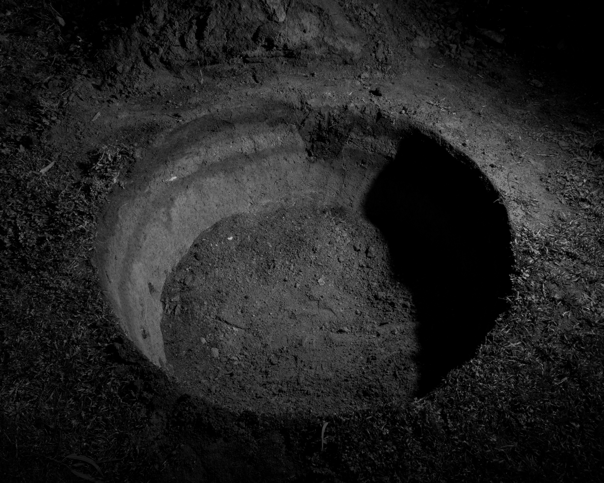 At the beginning of the most recent Covid-19 lockdown in September 2021, my son asked me to play real life Minecraft in the backyard. We started digging a modest hole and as the hole grew deeper and wider I became facinated with this unearthed void. A series of experiments followed where we drew the outlines of the respective holes with flames. When we turned the rectangular void into a cilindrical one we cut through the grave of one of my chickens, you can see the dimple in the layers of earth with clearly visible bones. We harvested clay from the bottom of the hole and fired little objects such as the little skull one depicted here.